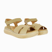 Sandalia de cuña para mujer de piel lisa y efecto coco en color taupe. Cuenta con suela de plataforma efecto madera, plantilla extraíble y cierre de velcro.