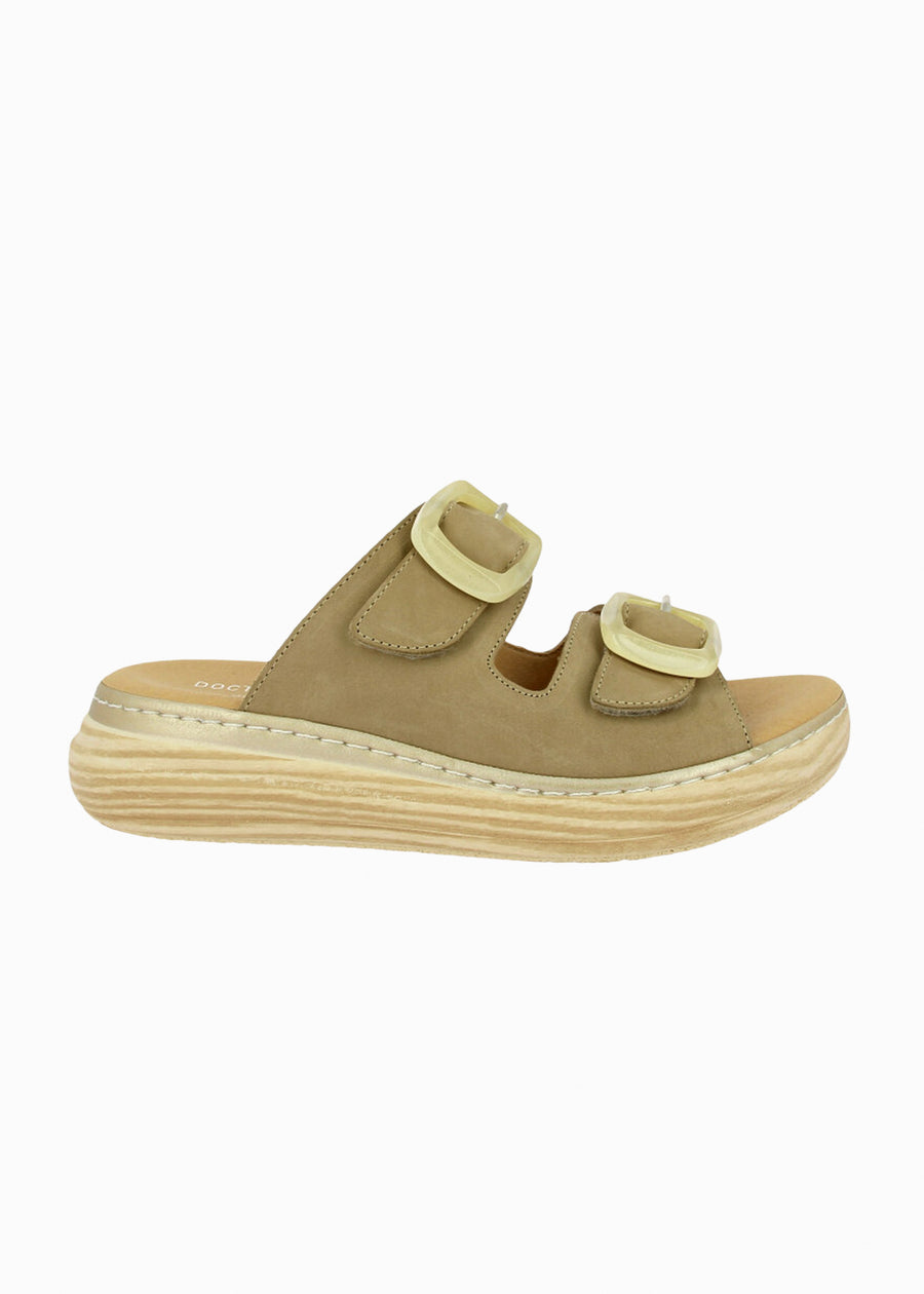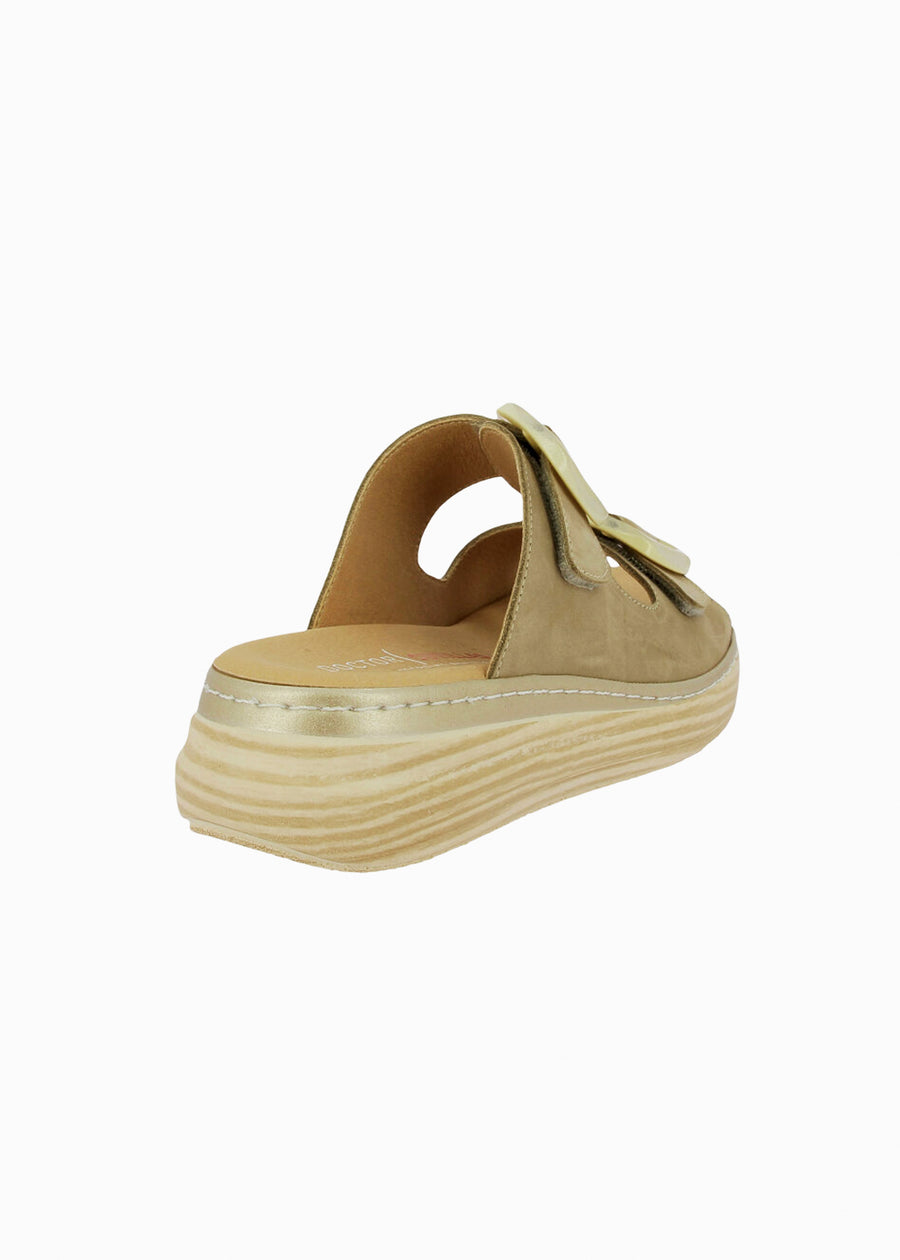Sandalia de cuña para mujer de piel lisa en color taupe. Cuenta con doble cierre de velcro con detalle de hebillas, suela de plataforma efecto madera y plantilla extraíble.