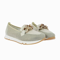 Deportivo tipo mocasín para mujer de piel y rejilla en color champagne con ribete elástico. Cuenta con empeine y talón en piel efecto coco, adorno de cadena y plantilla extraíble.