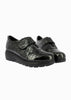 Zapato para mujer tipo inglés de piel grabada efecto serpiente en color baltic. Cuenta con suela dentada de cuña, forro Aloe Vera y cierre de velcro con elástico en empeine. El tejido Aloe vera tiene las siguientes propiedades: hidrata y suaviza la piel, es un antiséptico natural, actúa como antinflamatorio, elimina células muertas de la piel y favorece la salud del tejido. Además contiene iones de plata con poder anti bacteriano.